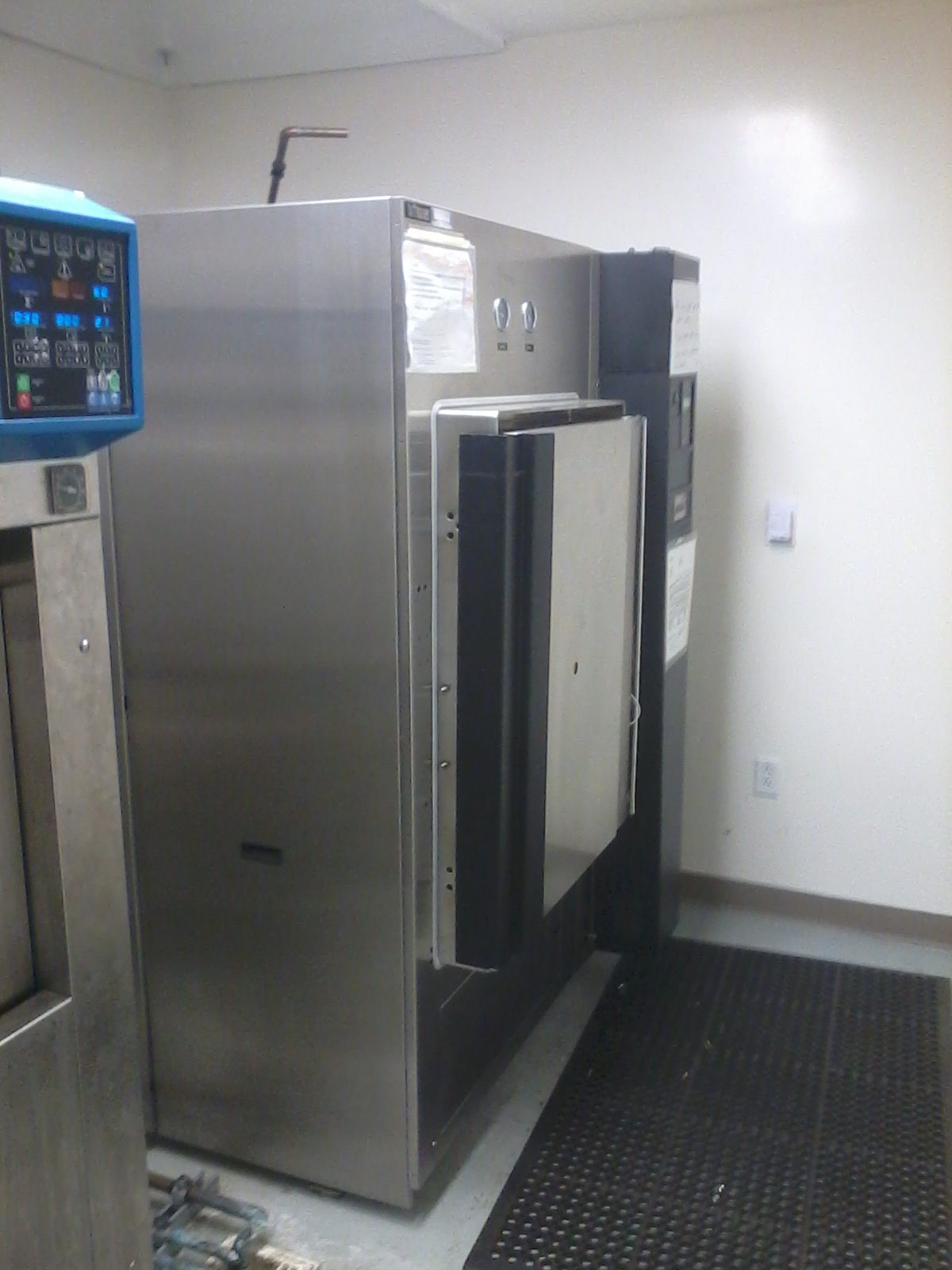 The autoclave cannot be opened until the steam has been condensed into water and removed from the machine. The bottom left of the picture on this blog shows the pipe where the hot water comes out of the autoclave.