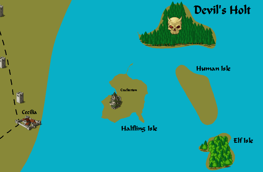 Crafterton is town with a population of about 60,000 people, most of whom are halflings. The town’s economy is based around factories powered by the strong wind blowing to the west towards Cecilia. The factories were once powered by wood fires, but the island’s forest has been severely depleted. Cutting wood is now only allowed during winter and even then only by government permit. Some of the more entrepreneurial halflings import wood from the lumber port of Makotako, but most are content to do without.