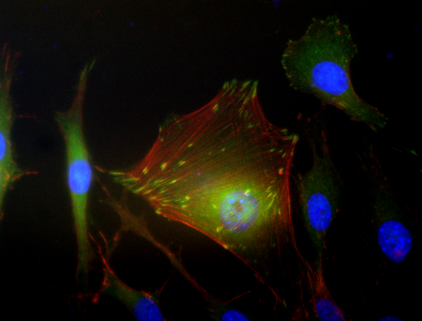 The blue parts are cell nuclei. Each cell has one nucleus and I’ll bet you can pick out the one that belongs to all the actin and vinculin in the middle of this picture.