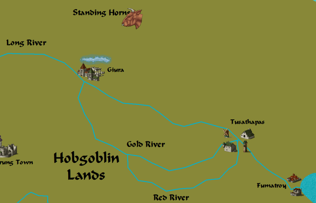 Tusathapas is a large city of 120,000 goblins and 20,000 hobgoblins. The city is situated around the junction of the Long River, the Gold River, and the Red River. The joining of the three rivers creates a nexus point that strengthens magic spells cast above the confluence. The people of Tusathapas take advantage of this to create magical goods to trade with the rest of the world and also to enhance their local breeding projects for plants and animals. The city’s love for magic extends even into their government where the leader is the most powerful magician decided by a biennial contest.