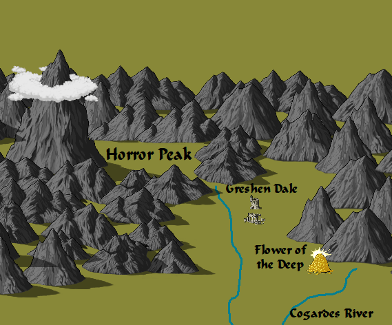Greshen Valley is a flat expanse that interrupts the high peaks of the Terror Mountains. The valley was settled by humans during the Time of Conclave. The settlers spread out into villages and homesteads with a central gathering place at the town of Greshen Dale. The valley was inhabited by monsters as well. Trolls, giants, and dragons threatened the villagers. The humans defended themselves with wizards and other magical practices. The greatest of these wizards was Tentineh.