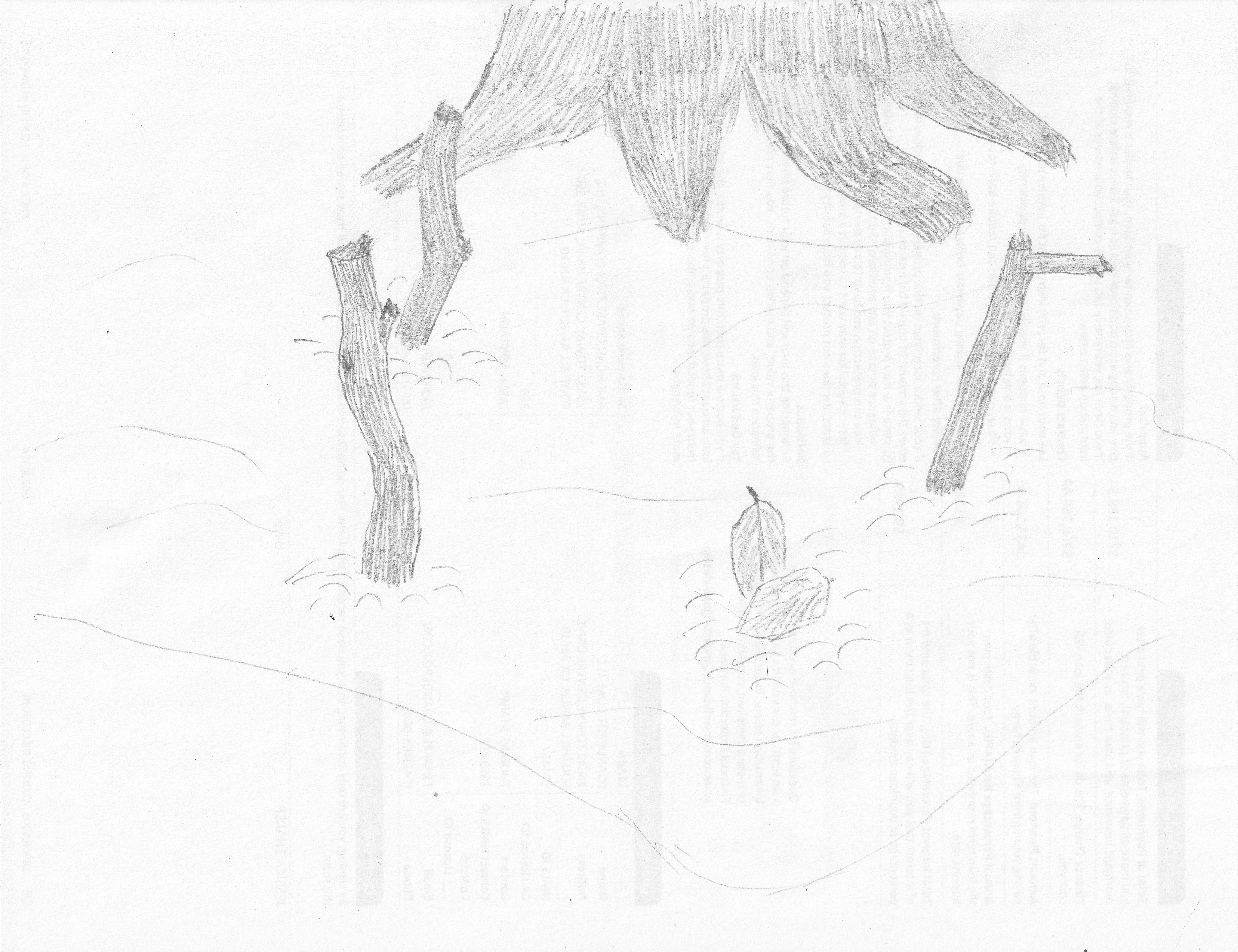 The next day the party reached a fork in the trail. One path led off to the right. The other led straight north and higher into the mountains. Korjak told the party that they were close to the bear lake and that they’d be there soon if they took the left path. Wanting to know how well traveled the path was, Wu looked for tracks. Instead of tracks he found three sticks planted unnaturally in the ground between the two tines of the “fork.” The sticks were planted like so,