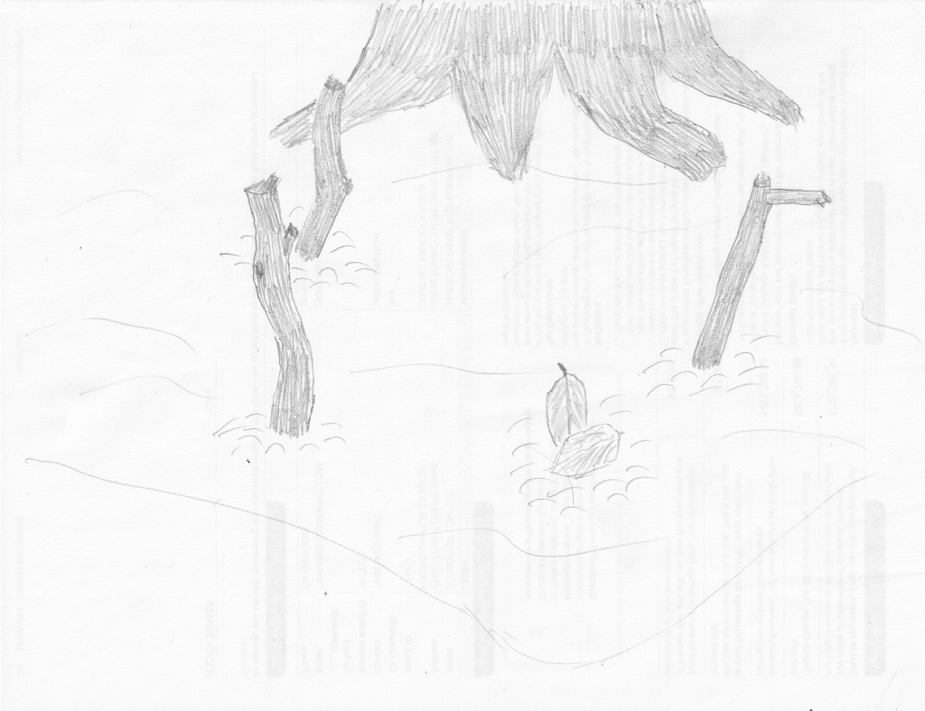 with two on the left close together and one on the right, apart from the others. After examining the sticks the party thought it might be an arrow pointing to the right. Sivirdm tried pulling the sticks out, but found himself too weak. The party guessed that the sticks were attached to something under the ground, but felt it wasn’t a root. Gregor pulled with his mighty strength. He pulled open a box buried with the dirt. Inside the box was a silver trident head with its barbs pointing to the left. The party guessed this meant that the lake lay to the left and something else was to the right. Additionally, Stanton found the trident to be magic. A haft was quickly honed from a good tree branch to use the trident if necessary.