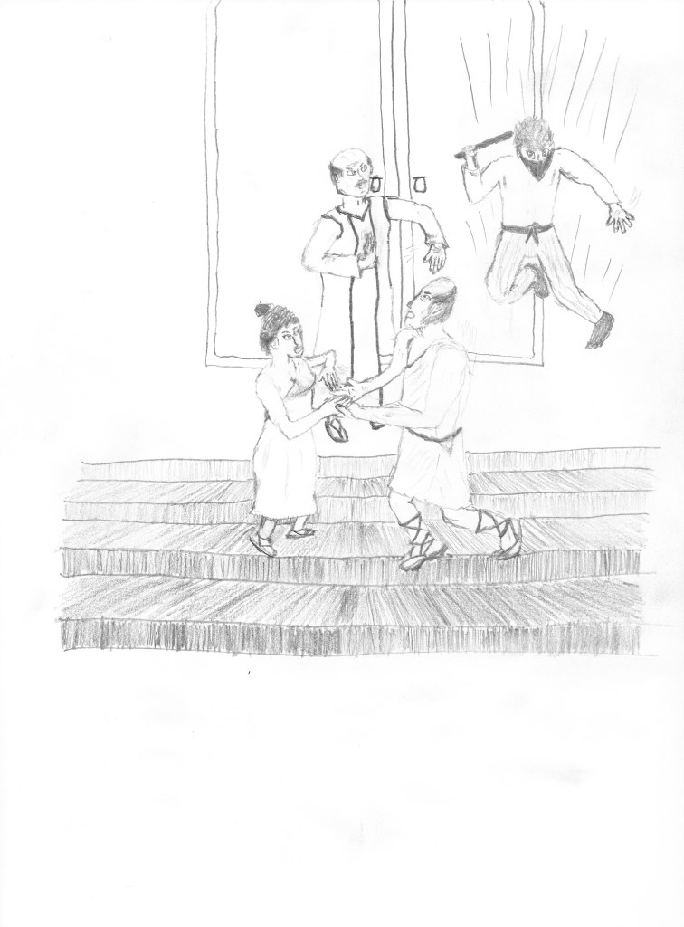 The priest continued, “Cassandra has told me she wishes to sing one more song as a maiden before she is wed.” He turned to Cassandra and touched her on the shoulder with a magic spell to project her voice. “When you’re ready, Cassandra.”