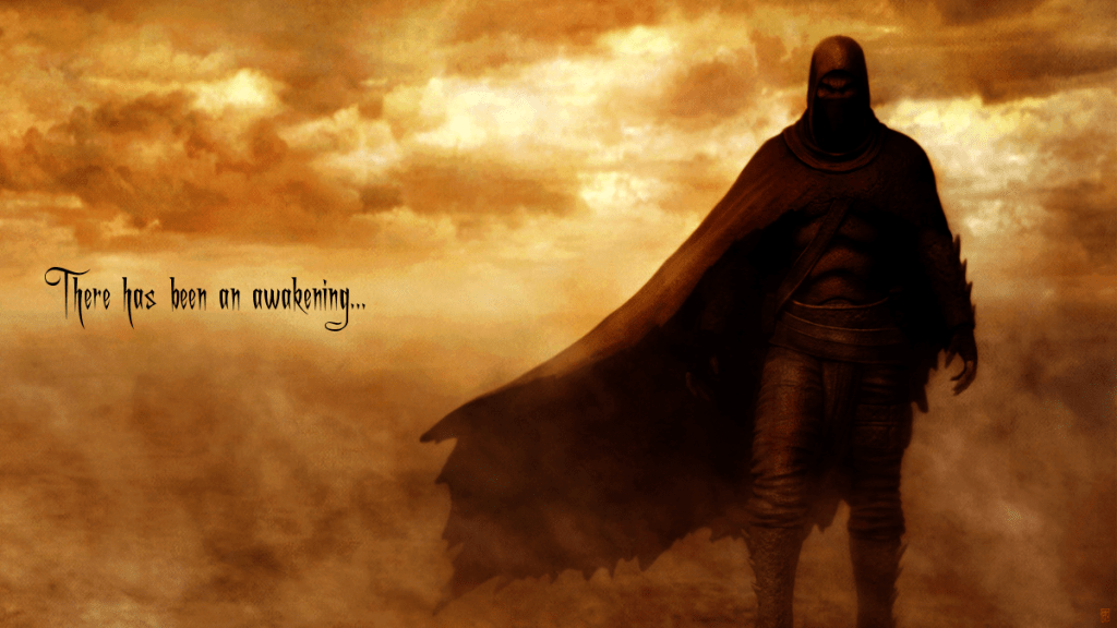 Barakah had skin the color of red desert sand. When standing he measured more than thirteen feet tall. He wore a cowl over his face, but he pulled it back to reveal a white gold crown upon his head. His eyes were black when the party had first met him, but they had darkened, the cornea, iris, and pupil combined into an incomprehensible void that was a headache to look upon. A long, heavy cloak of brass dragon scales draped itself across his shoulders. Around his throat was a thick chain of dythalidium, the strongest metal in existence made from the waters of the Dythalid Pool in Mars’ Oasis. Behind Barakah rested a shield and suit of armor of the same material beside open sacks of food and other provisions.