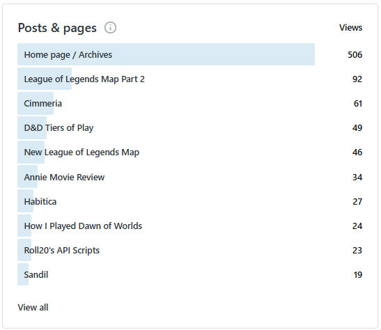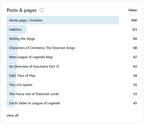 As for what’s popular, there isn’t really a change from 2021. All the same stuff of League of Legends, general D&D articles, Habitica, and Dwarven Kings. How I Played Dawn of Worlds is also a consistent popular article as it appeared in 2019 and 2021 as well. I guess it’s an okay primer on how to get started playing that game digitally? It’s pretty minimal though. I hope it helps some people though!