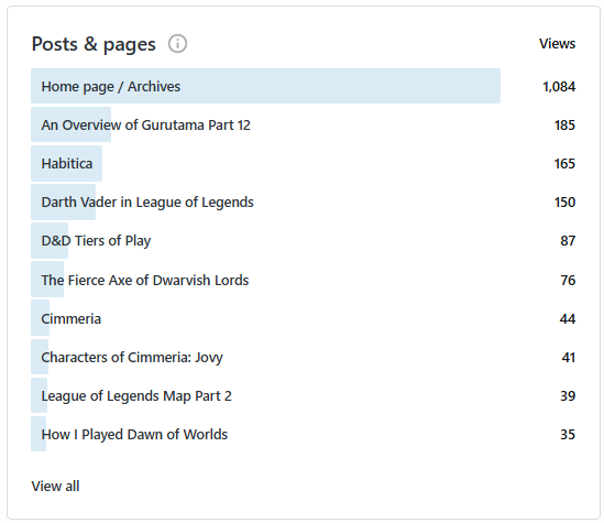 I had a total of 6719 views in 2024. A whole doubling since 2023. And there’s some obvious leaders. I’d started doing more RPG reviews which I guess are more popular content than I was expecting. My New League of Legends Map content absolutely exploded, but sort of for the wrong reasons. I wrote that article in 2014. The map got redone once again in 2024 which had lots of people searching for content on that. And my old article had all the right search terms, but the wrong “new” map.