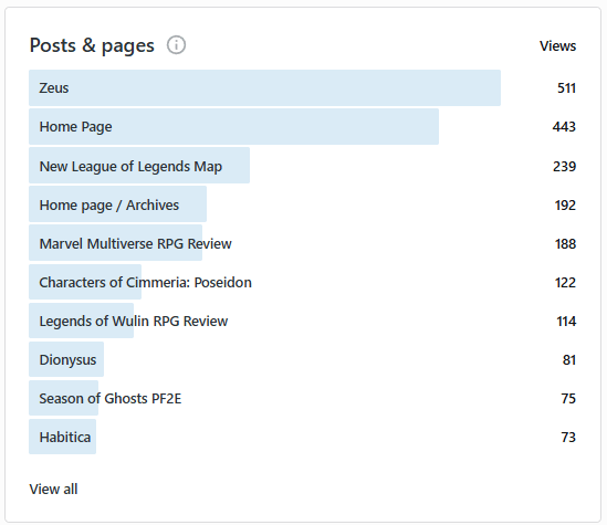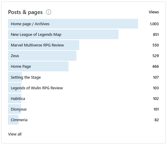 I’ve had a total of 3763 views in 2025 so far. I’m writing this at the end of May, so if we multiple that number by 12/5 we get 9031 expected for the whole year. Even better than 2024! Pretty much the same leaders as 2024 though, League of Legends, Greek Gods, RPG reviews, Habitica, and Setting the Stage.