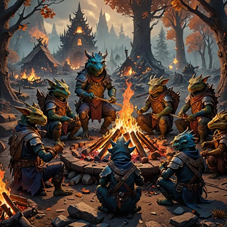 Kobolds enjoying a nice meal around a campfire in their front yard. While their houses burn down in the background.