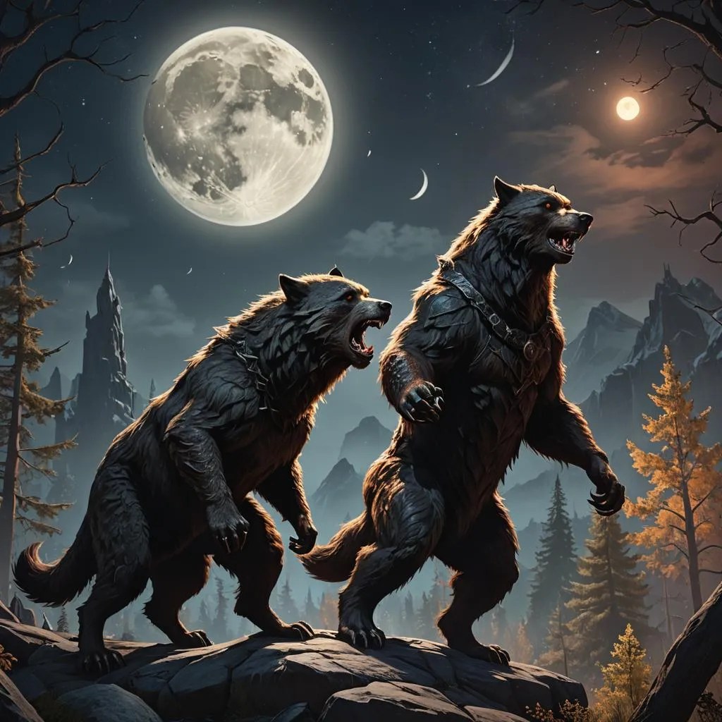 Or if you want to have some werewolves howling at the moon. And then the AI puts four moons in the sky plus a night-time sun for some reason. And the werewolf on the left has three back legs.