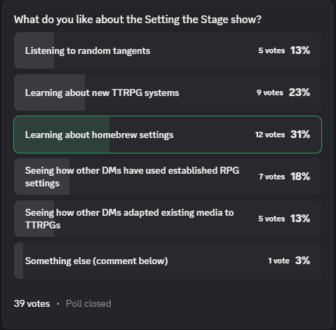 Not a clear winner, but homebrew lore was the most popular along with homebrew TTRPG systems being a close second. I know that most of the people in the server fit the Carson customer profile because the population on the STS Discord is mostly guests on my show. They aren’t all Carsons, but most of them are.