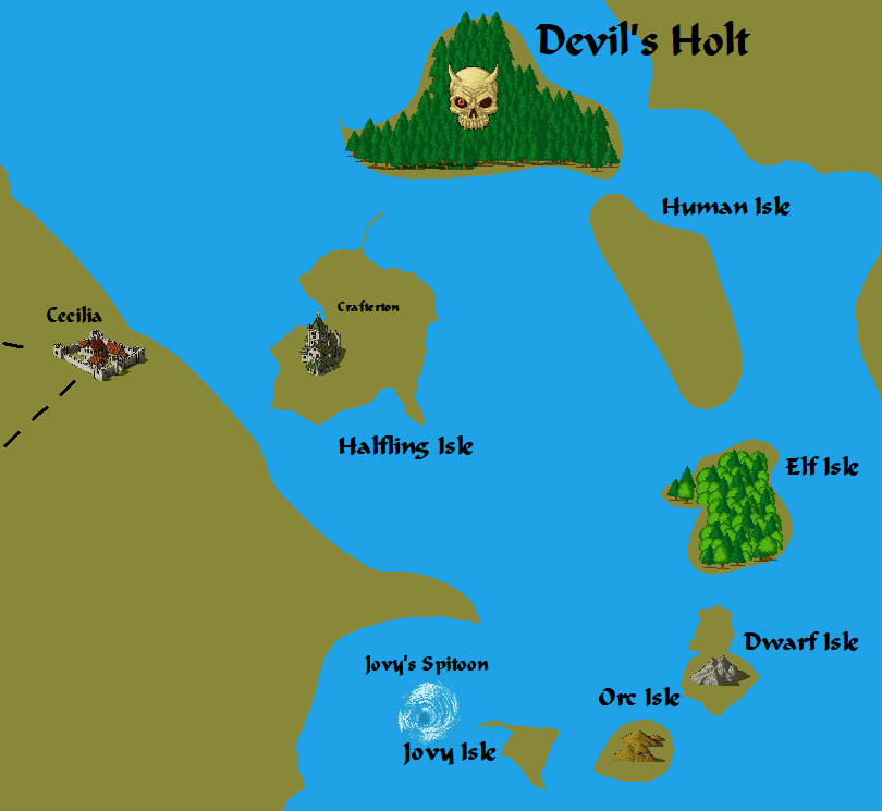 Crafterton is town with a population of about 60,000 people, most of whom are halflings. The town’s economy is based around factories powered by the strong wind blowing to the west towards Cecilia. The factories were once powered by wood fires, but the island’s forest has been severely depleted. Cutting wood is now only allowed during winter and even then only by government permit. Some of the more entrepreneurial halflings import wood from the lumber port of Makotako, but most are content to do without.