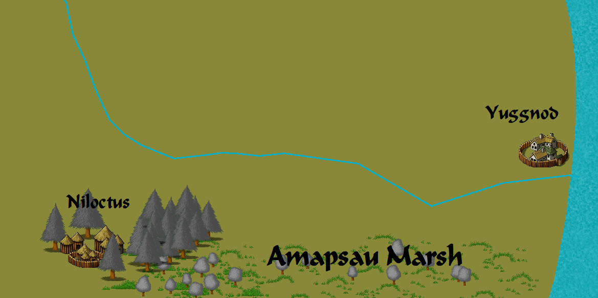 There is a hidden orchard within Amapsau Marsh that grows silver apples. This orchard is a twin to the golden apple orchard at the Pillars of Hercules in the west. The location of the orchard is a closely guarded secret of Nilcotus to ensure their valuable treasure is not stolen by others. In addition to having an obscure location the orchard is rumored to be guarded by a powerful monster.