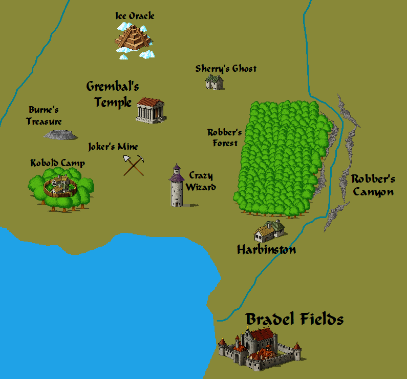 The area around Harbinston was where Sherlock‘s adventuring party followed his magical stone tablet map. The map led them all around the region and eventually to what would be known as Sherlock’s Tower. Sherlock used the tower to gain great magical power, but the activation killed two of his companions, Sherry and Egon. His final companion, Burne, swore revenge. Burne returned to Harbinston to protect the town, but he eventually found that Robin Hood style brigandry was the best way to support his community. The bandit problem eventually led to Burne’s death as a new group of adventurers came to the region led by Terroc.