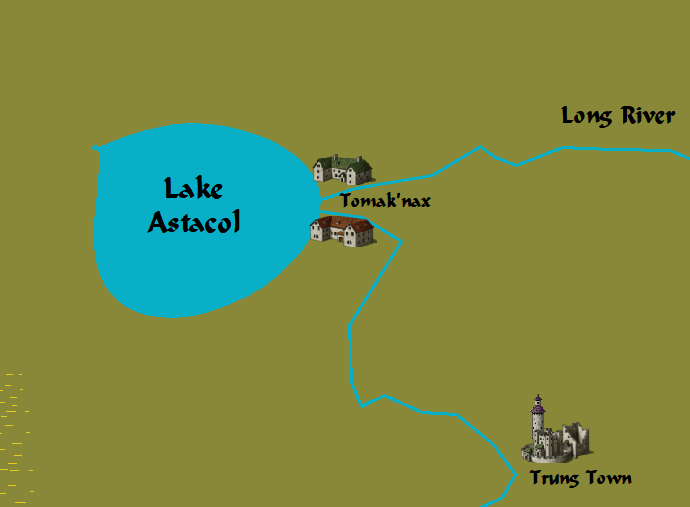Lake Astacol was the home of the Goblin god, Crayfish. It lived within the lake fed by magical springs. While Crayfish lived within Lake Astacol the Long Pearl River provided irrigation for the lands to the east. When the Olympians invaded Poseidon fought with Crayfish. Their fierce battle split the earth and the river in two. The Long Pearl River fractured into the Long River in the north and the Pearl River in the south. Tomak’nax, the city at the Long Pearl’s head was also split in two as well. Now two rivers and an eight mile stretch of soggy land separate the two halves of the city. The two halves of Tomak’nax stay connected by the Cableway, an enormous cable ferry between the two cities.