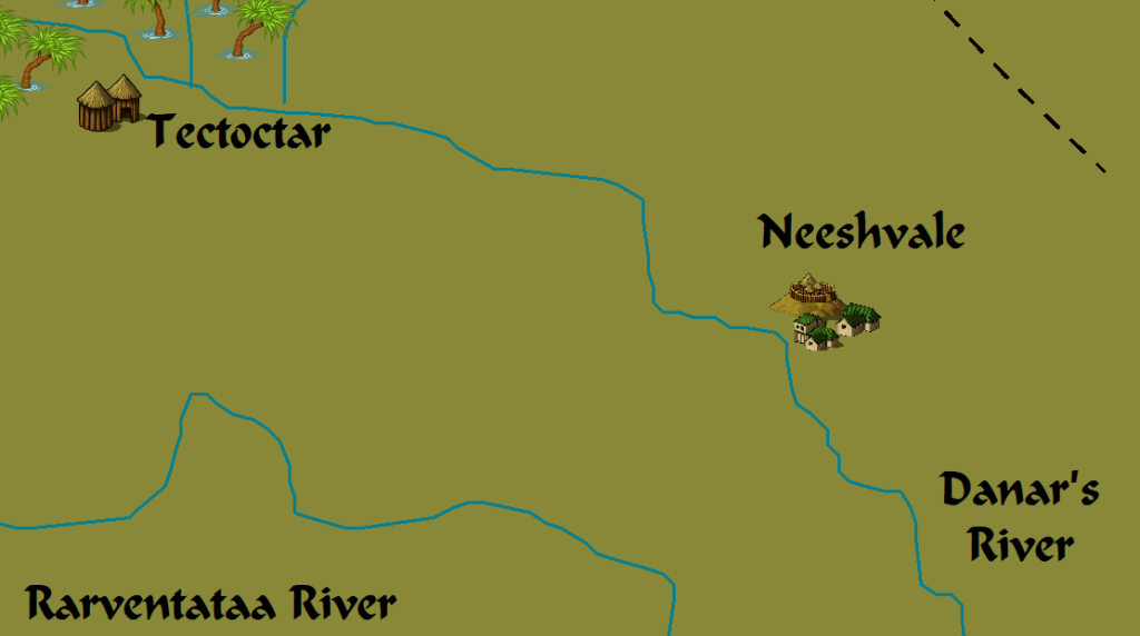 The village was recently conquered by an orc necromancer named Ratigon. He had been exiled from the Endless Autumn orc tribe in the Orc Lands. He made his way west until he found Neeshvale and conquered it with his undead minions. Ratigon lived off the villagers for a time until Gregor passed through. The necromancer bowed down to the orc king and vowed to serve him. Gregor demanded that Ratigon go back to the Orc Lands and spread news of his return. Ratigon did as commanded and left Neeshvale in peace.