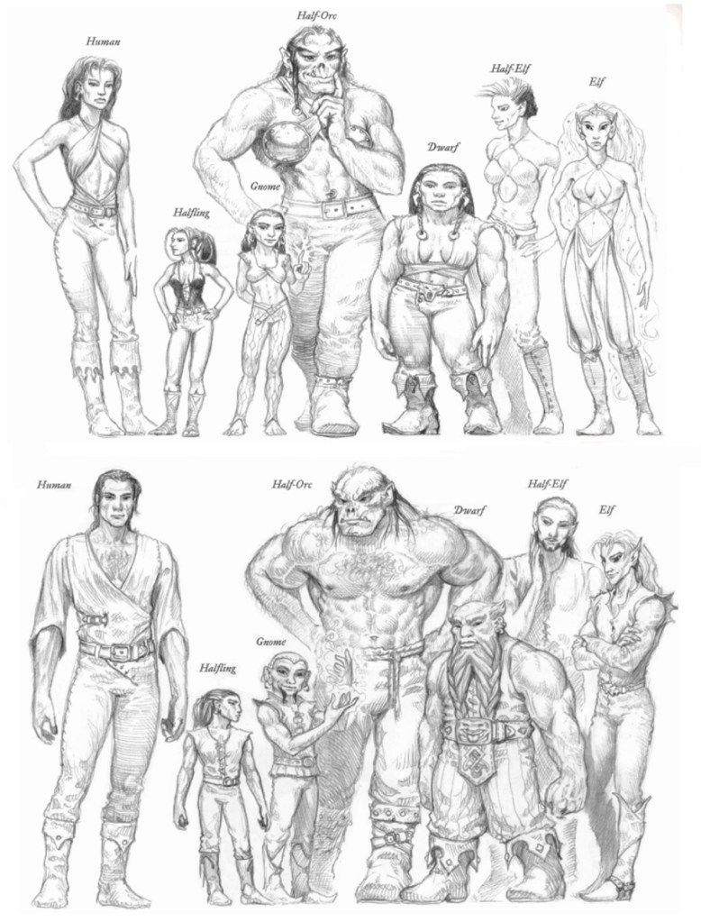 Elves – Elves have thin builds, long lifespans, and excellent senses. They value art and beauty. Many elves become amazing craftsmen after centuries of study. They are an insular people, rarely emerging from their forests for any other purpose besides trade.