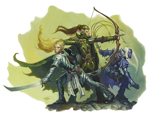 High Elves: High Elves are on the taller end of the elf height spectrum. They typically have blonde, brown, or auburn hair. Their eyes are usually green or amber. High Elves are experienced users of abjuration magic, often learning a few minor protective spells and wards at a young age. They are adept at fighting goblins and orcs due to their proximity to the Orc and Hobgoblin Lands. Many High Elves choose magic as their defensive tool, but those who use weapons specialize in the bow and arrow or dual wielding swords. The High Elf combat style was refined into the way of the ranger and taught to outsiders after the Dragon War. High Elves are friendly towards the other races, but few non elves are allowed into the heart of Valor’s Forest where the High Elves make their home. High Elves are ruled by a council of elders.