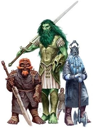 There are many kind of giants in Cimmeria but they are all huge, strong, and ferocious. The smallest giants stand at about eight feet tall while the largest are more than twenty feet tall. Weights are similarly variable with giants often being heavy for their relative height due to increased fat and muscle mass. The might of giants is legendary. Commonly giants will wield boulders as ranged weapons, throwing the large rocks accurately at targets several hundred feet away. Many giants are also blessed with minor supernatural powers. These powers vary between the different subraces of giant with no unifying factor across the whole race.
